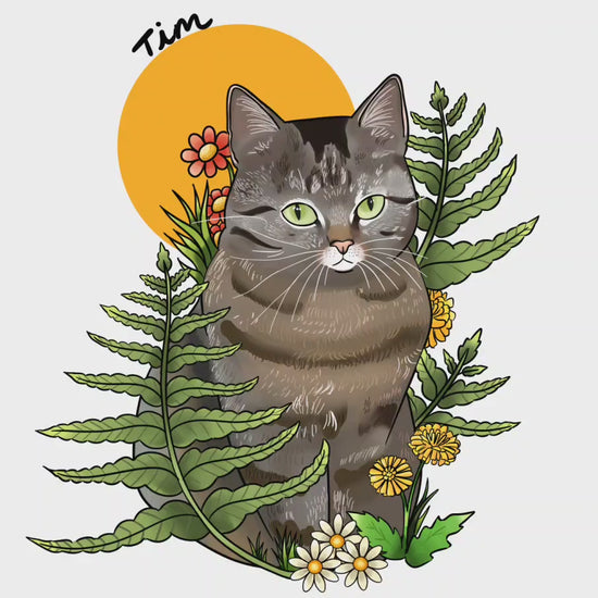 A portrait of Timid Tim the cat that was gifted as a Christmas present. Surround by ferns, dandelions, daisies and grass. With a golden yellow circle behind him.